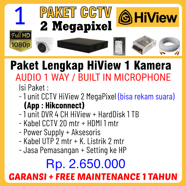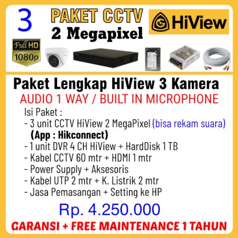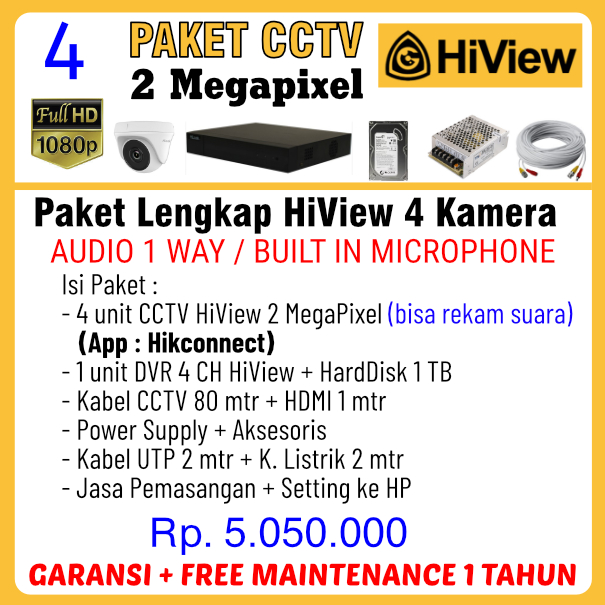 Paket CCTV HiView 2Mp Audio Paket CCTV HIVIEW 2Mp Audio Paket CCTV Lengkap sudah termasuk jasa pemasangan / instalasi. Merk HIVIEW dengan aplikasi sama dengan Hikvision yaitu HikConnect. Resolusi Full HD 2 Megapixel 1080P.
